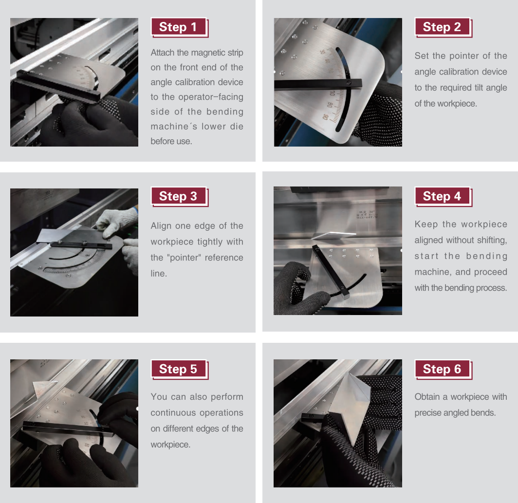 In traditional sheet metal bending, if the bend line isn’t parallel to the positioning edge, operators usually rely on experience to make manual adjustments or use an expensive six-axis back gauge for correction. Our smart sheet metal bending angle calibrator features an innovative design that allows precise corrections within a 30°-150° range. Simply adjust the calibrator to the desired angle, and the reference pointer provides a clear guideline, ensuring accurate bends every time.