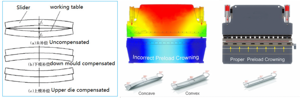 A CNC press brake is an important piece of equipment in sheet metal processing, and its working accuracy directly affects the bending precision of the workpiece. During the bending process, the press brake experiences the greatest force at both ends of the slider. The reaction force from the material bending causes the lower surface of the slider to deform into a concave shape. The deformation is most pronounced in the middle part of the slider, causing the final bending angle of the workpiece to vary across the entire length.